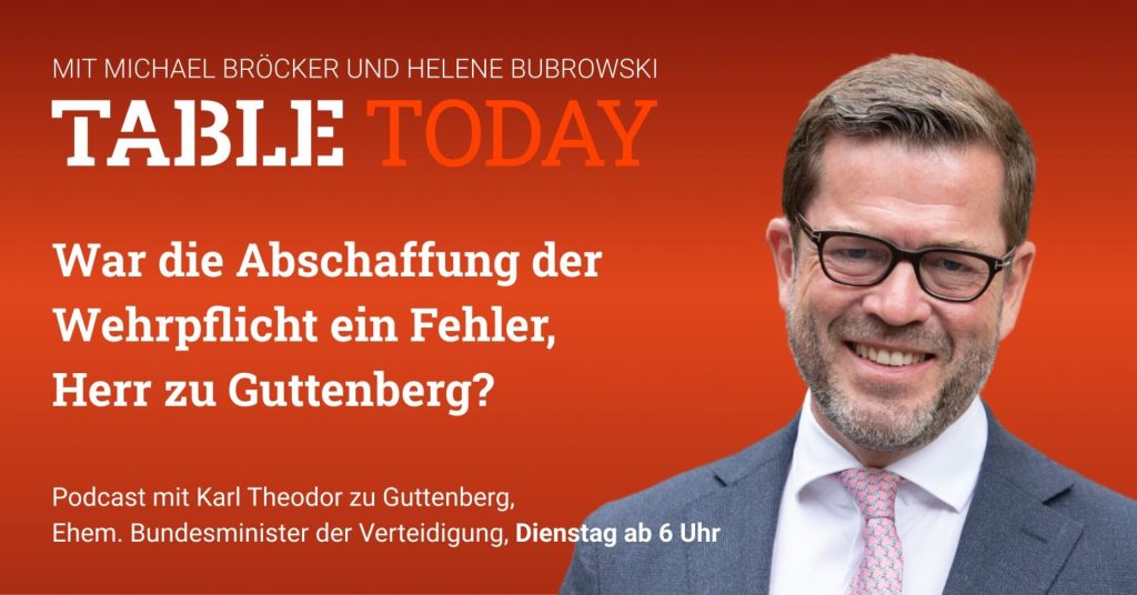 Er war einmal die Zukunftshoffnung der CSU. Ein Mann, der Glanz in den grauen Berliner Politikbetrieb brachte. Dann fiel er tief. In seiner kurzen Amtszeit als Verteidigungsminister hat Karl-Theodor zu Guttenberg eine Entscheidung getroffen, mit deren Konsequenzen sich die Bundeswehr und sein Amtsnachfolger heute herumschlagen müssen: die Aussetzung der Wehrpflicht. Wie der Ex-Politiker heute darüber denkt und warum “KT Guttenberg” eine Berufsbezeichnung ist, erzählt er im Podcast Table.Today. Das Gespräch hören Sie ab 6 Uhr hier.