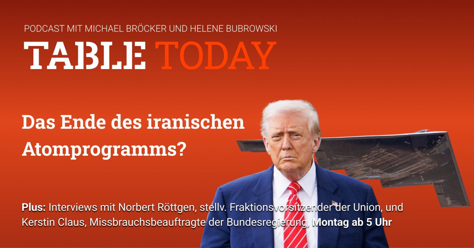 Atomprogramm: Norbert Röttgen hofft auf Verhandlungen. Norbert Röttgen sieht die Chance, dass der Iran sein Atomprogramm als Folge der US-Militärschläge aufgibt. „Für die Möglichkeit, dass Iran jetzt sich gezwungen sieht, den diplomatisch-politischen Weg einzuschlagen, ist mehr Druck erzeugt worden“, sagt der stellvertretende Vorsitzende der Unionsfraktion im Podcast Table.Today. Ob die Entscheidung Trumps, iranische Atomanlagen anzugreifen, richtig war, könne man erst im Rückblick beurteilen. Der CDU-Außenpolitiker sieht in den Angriffen eine Abkehr von Trumps bisherigem Verhaltensmuster der „großen Worte und wenig Handeln“. Jetzt habe der US-Präsident den großen Worten auch Taten folgen lassen.