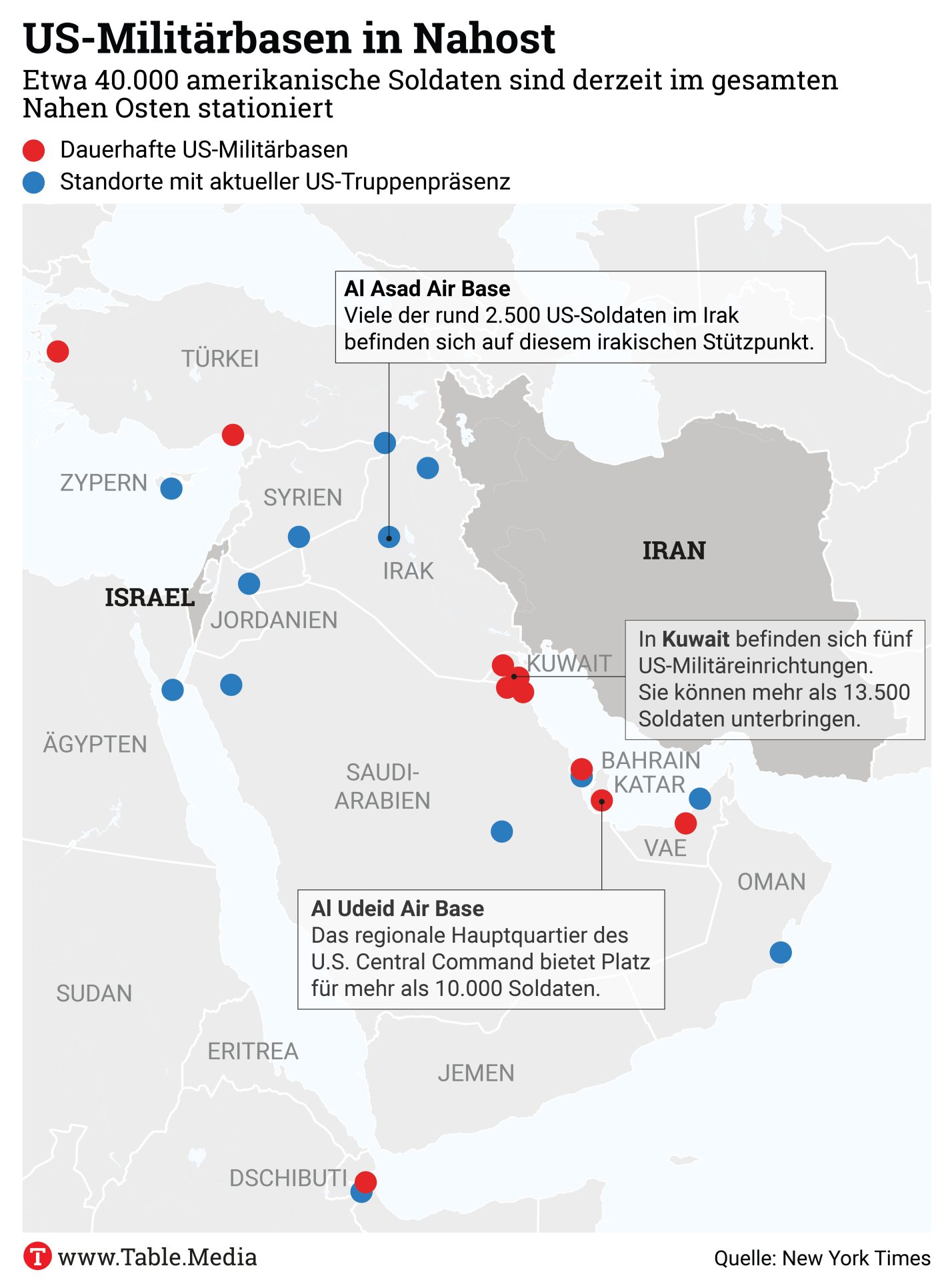Die Vereinigten Staaten verfügen über militärische Einrichtungen an mindestens 19 Standorten im Nahen Osten. Schiitenmilizen wie die Kata’ib Hisbollah gehören neben der Hisbollah im Libanon, den Huthi im Jemen und der Hamas in Palästina zu den Säulen der sogenannten Achse des Widerstands. Mit dem Sturz des Regimes von Baschar al-Assad im Dezember in Damaskus verlor das Regime in Teheran jedoch seinen einzigen staatlichen Verbündeten in dem antiisraelischen Bündnis.