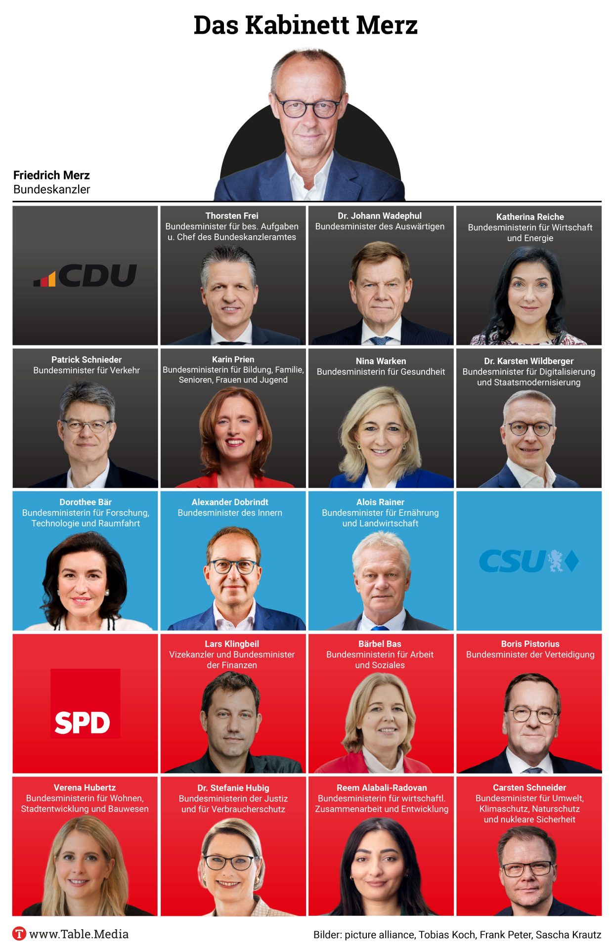 Ihren ersten Auftritt im Amt haben Wirtschaftsministerin Katherina Reiche, Kanzleramtsminister Thorsten Frei und Digitalminister Karsten Wildberger. Außerdem sind unter anderem Grünen-Chef Felix Banaszak, NRW-Ministerpräsident Hendrik Wüst, Ex-Minister Karl-Theodor zu Guttenberg, Nato-General Markus Laubenthal, Wacker-CEO Christian Hartel, Bitpanda-Chef Eric Demuth, der Vorstandsvorsitzende von Audi, Gernot Döllner, die Chefin der Bundesagentur für Arbeit, Andrea Nahles, und der Gewerkschaftsvorsitzende Michael Vassiliadis.
