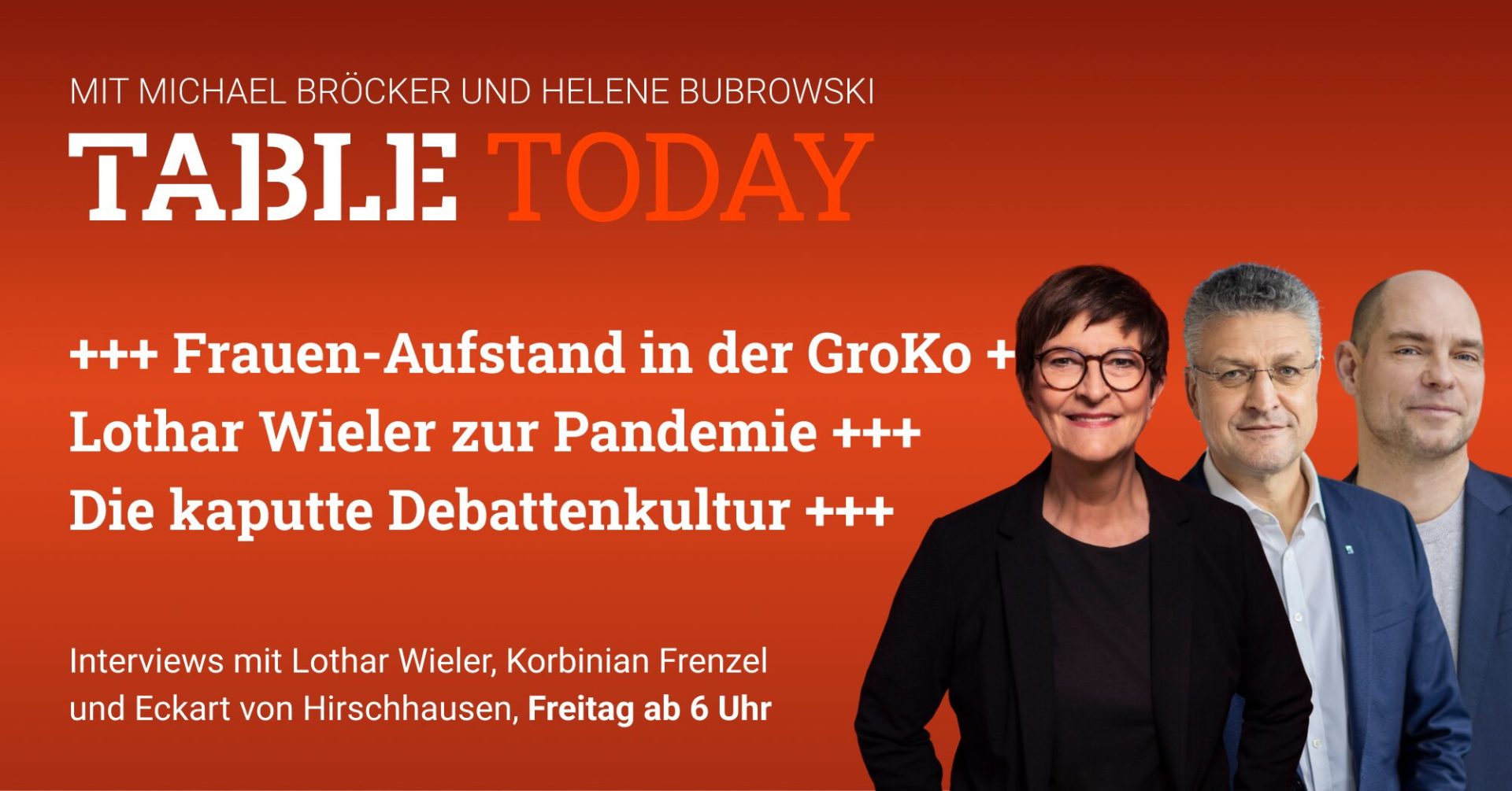 Helene Bubrowski und Michael Bröcker diskutieren über den Aufstand der Frauen in Union und SPD und analysieren mit dem Deutschlandfunk-Moderator Korbinian Frenzel, ob die neue große Koalition eine neue Debattenkultur in diesem Land bringen könnte. Außerdem hat der Arzt und Moderator Eckhart von Hirschhausen einen kleinen Gastauftritt. Den Podcast hören Sie ab ab 6 Uhr hier.