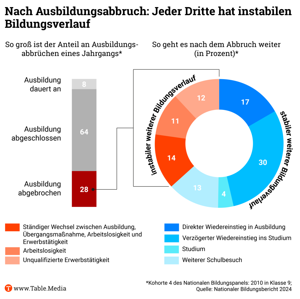 Ein Abbruch ist nicht immer ein Problem, wenn Jugendliche zum Beispiel nur den Betrieb wechseln oder sich umorientieren. Aber gerade bei Jugendlichen aus dem Übergangssektor ist das Abbruchrisiko hoch, bei ihnen liegt es bei 45 Prozent. Und das Problem ist, dass diese Jugendlichen meist in kleinere Betriebe einmünden, die keine so professionelle Ausbildungsinfrastruktur haben. Dort kümmern sich die Ausbilderinnen und Ausbilder häufiger nebenberuflich um die Azubis.