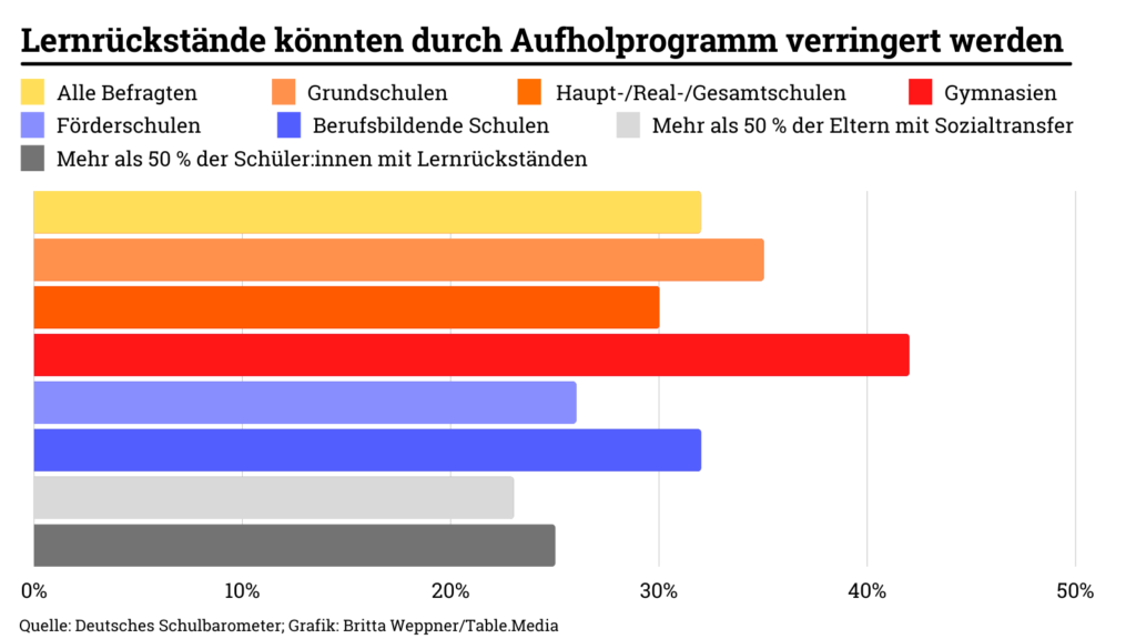 Lediglich jede vierte Schulleitung in Brennpunktregionen verzeichnet eine Wirkung der Corona-Aufholprogramme. Besser fällt das Urteil an Gymnasien aus, wo 42 Prozent einen Effekt sehen. Insgesamt bestätigt nur ein Drittel der Schulleitungen, dass sich die Maßnahmen der Bundesregierung zum Ausgleich von Lernrückständen ausgezahlt haben. Die große Mehrheit der Schulleitungen (70 Prozent) benötigt weitere Fördermittel.