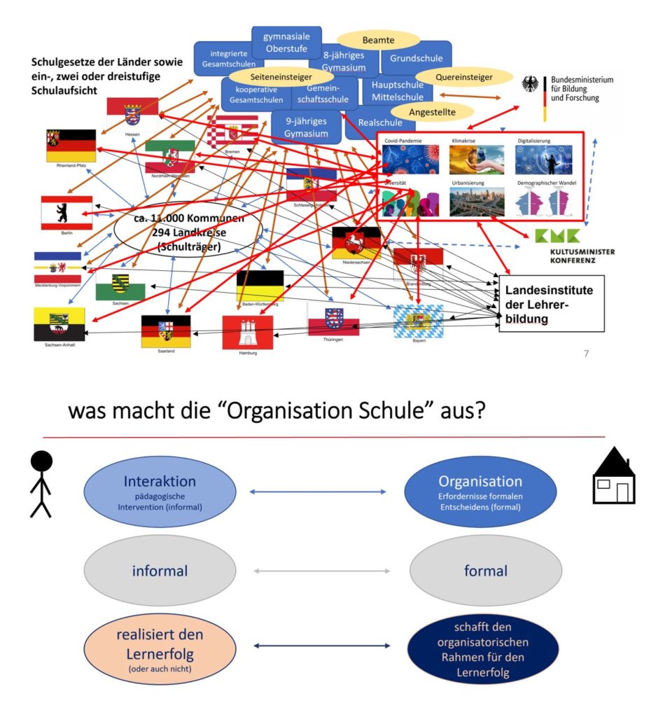 Natürlich ist diese Ebene wichtig. Die Schulen brauchen ja von irgendwo her die Mittel – und die kommen nun mal vom Bund und vom Land. Nur: Die Systemebene ist nicht gerade trivial organisiert. Ich habe mal versucht, in einer Skizze über Kommunikationsbeziehungen ansatzweise verständlich zu machen, wie die Kommunikationswege zusammenhängen. Herausgekommen ist eine Art “Wimmelbild” – und man erkennt: Das Bildungssystem ist eigentlich nicht mehr steuerbar.
