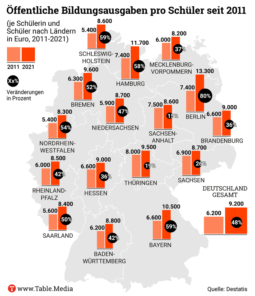 Durchschnittlich 9.200 Euro gab die öffentliche Hand pro Schüler im Jahr 2021 aus. Im Bundesdurchschnitt sind die Ausgaben damit binnen zehn Jahren um 48 Prozent gestiegen. Besonders stark wuchsen die Ausgaben in Berlin. Hier beträgt der Anstieg 80 Prozent; 13.300 Euro kostet ein Schüler den Senat pro Jahr. Den geringsten Aufwuchs verzeichnen Thüringen (19 Prozent) und Sachsen-Anhalt (15 Prozent). Das geht aus der Auswertung aktueller Daten des Statistischen Bundesamts hervor.