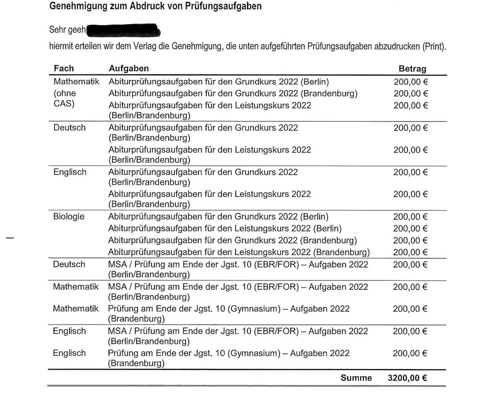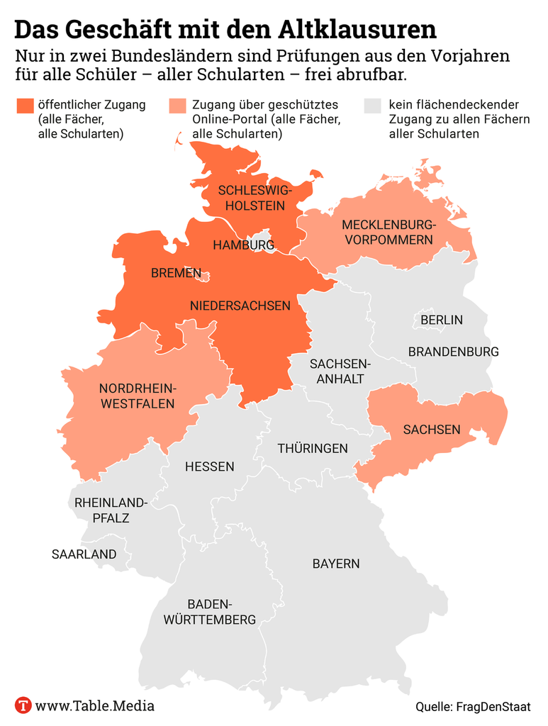 Für die Kampagne “Verschlusssache Prüfung” haben die beiden NGOs – per Anfrage über die Informationsfreiheitsgesetze – bei den Ministerien angeklopft. Table.Media und die Süddeutsche Zeitung konnten das Recherchematerial vor Veröffentlichung exklusiv auswerten. In vielen Bundesländern, das zeigt die Abfrage, können Eltern und Schüler die Aufgaben, die mit Steuergeld erstellt wurden, nicht einfach benutzen. Stattdessen müssen sie teure Übungshefte beim Stark-Verlag kaufen – Kostenpunkt: bis zu 15 Euro pro Heft.