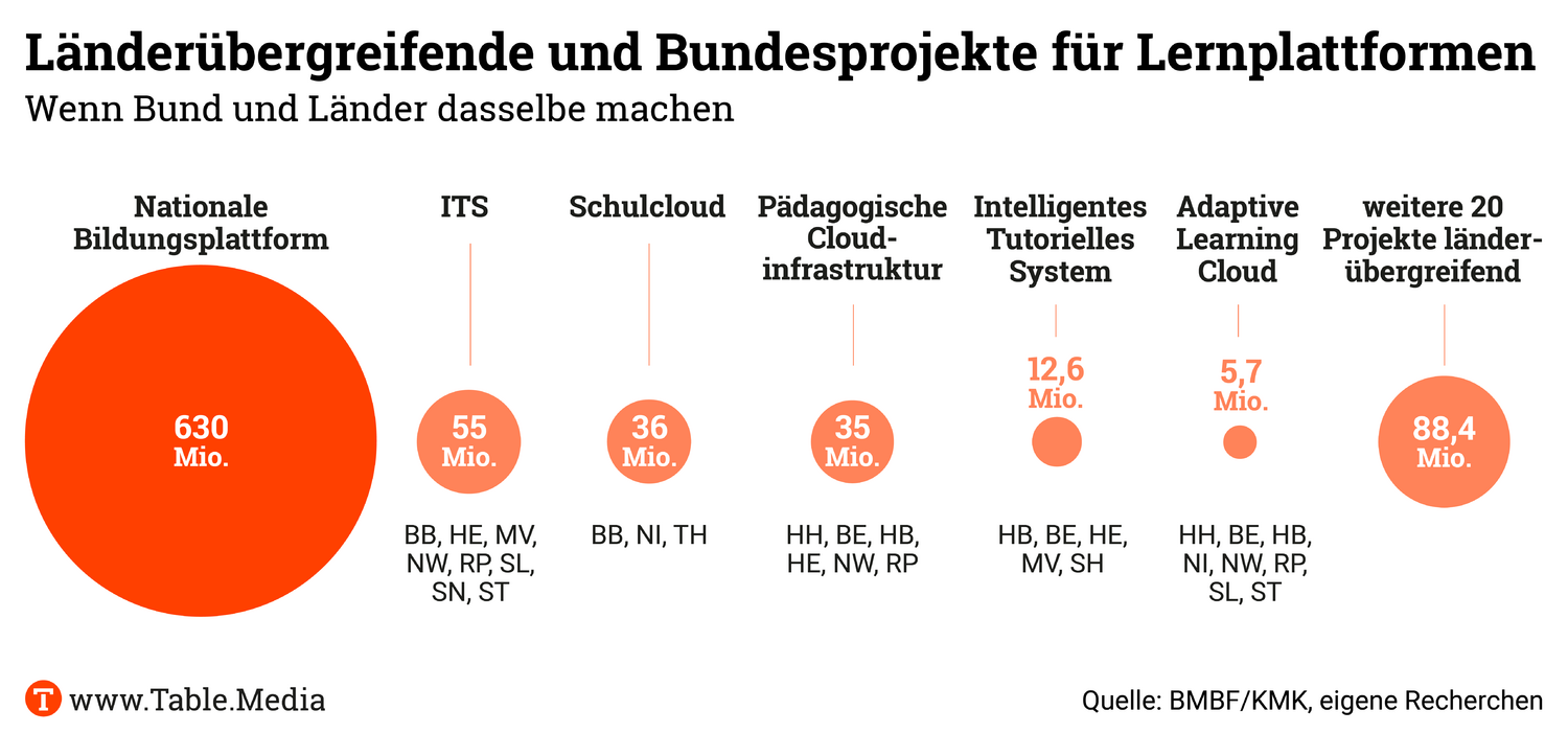 Betrachtet man den Bund als wichtigsten Nettozahler für digitale Projekte, so sieht man: Der Staat investiert geradezu schwindelerregende Beträge in digitale Projekte, deren Einmaligkeit sich manchmal selbst auf den zweiten Blick nicht erschließt. Insgesamt fließen rund zehn Milliarden Euro in die großen Vorzeigeprojekte vom Digitalpakt Schule über die Bildungsplattform bis hin zu den Lernwolken der Länder. Eine Liste nur dieser Lernplattformen summiert sich auf rund 1,5 Milliarden Euro.