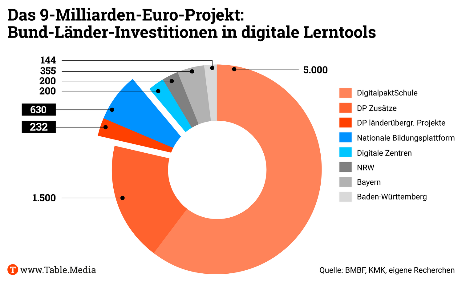 Die Präsidentin der Kultusminister bestand gerade im Table.Media-Interview darauf, schnell einen Nachfolger für den “Digitalpakt 1” zu vereinbaren. Aber während Katharina Günther-Wünsch (CDU) bereits neues Geld verlangt, gehört auch das Gremium, dem sie vorsitzt, zu den Verzögerern und Verschwendern. Das zeigt eine Table.Media-Recherche über die Ausgaben für digitale Tools. Bund und Länder geben in einer Vielzahl von Projekten Geld für Lernplattformen und virtuelle Klassenzimmer aus – oft ohne einen klaren Überblick zu haben. Die Recherche zeigt, dass der Staat digitale Infrastrukturen, Schulclouds und Lernportale im Wert von rund 1,5 Milliarden Euro vorantreibt. Aber zu den Digital-Profis am Markt gelangt das Geld eher tröpfchenweise.