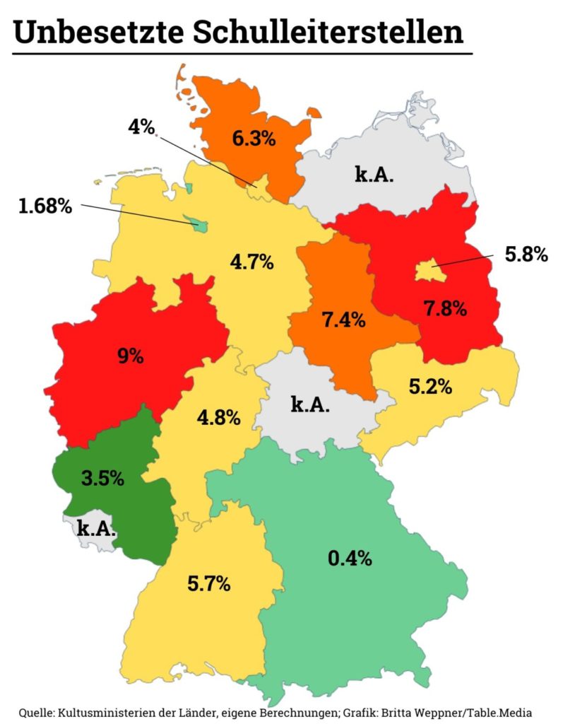 Neun Prozent aller Schulen in NRW sind aktuell auf der Suche nach einem Schulleiter. Doch es gibt kaum noch Lehrer, die sich befördern lassen. Jede zehnte Stelle ist vakant, bei den Stellvertreterposten ist es sogar jede fünfte. Besser sieht es im Süden aus: In Bayern sind im aktuellen Schuljahr lediglich 0,4 Prozent der Schulleitungsstellen unbesetzt. Das geht aus einer Anfrage von Bildung.Table an die Ministerien der Länder hervor.