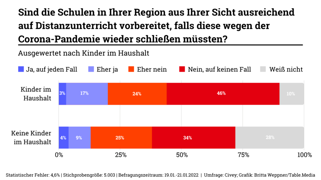 Wenn die Fallzahlen derart steigen, wird es unweigerlich zu mehr digitalem Unterricht kommen. Auf Distanzunterricht sind die Schulen laut der Umfrage jedoch nicht ausreichend vorbereitet. Es ist ein desaströses Pandemie-Zwischenzeugnis für die deutsche Bildungspolitik. Besonders groß ist das Misstrauen in Haushalten mit Kindern. Dort erlebte man das Distanzlernen aus der Nähe. Befragte mit akademischer Bildung sehen die Schulen besser vorbereitet (17 Prozent sagen “Ja, auf jeden Fall” bzw. “Eher ja”). Unter Befragten mit Hauptschul- oder ohne Abschluss sind nur 7 Prozent dieser Meinung.