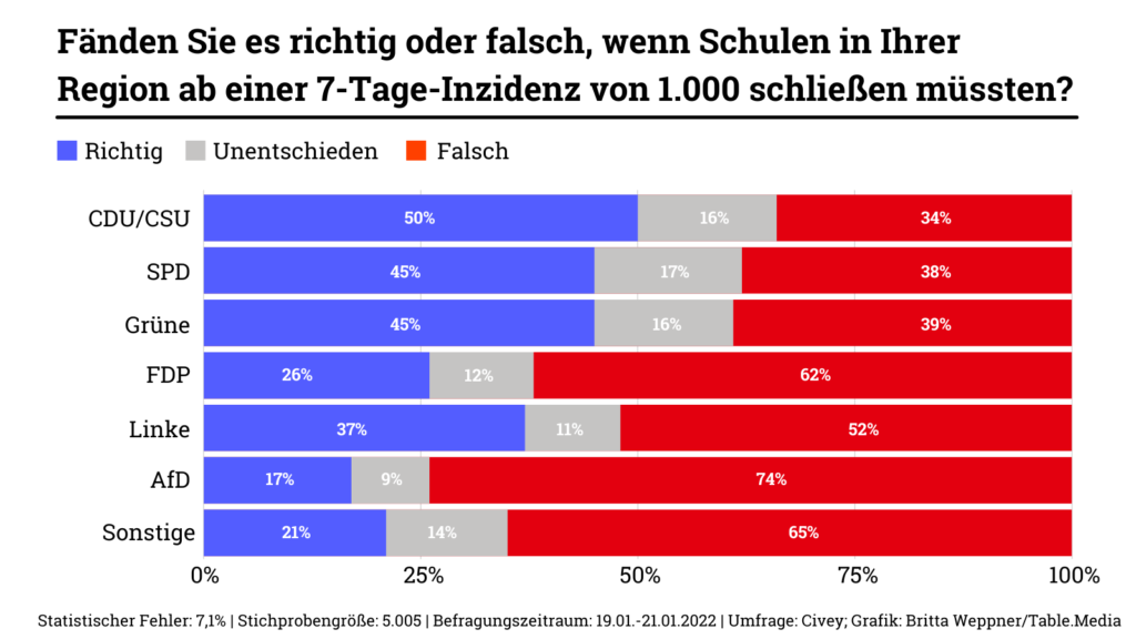 Die Umfrage, für die Civey 5.000 Menschen repräsentativ befragte, gibt zudem ein differenziertes Bild zu der Frage: Sollen Schulen unter derzeitigen Inzidenzen offen bleiben? Bisher hatte eine Mehrheit Schulschließungen abgelehnt. In einigen Bundesländern (Bremen, Hamburg, Niedersachsen, Schleswig-Holstein, Berlin und dem Saarland) spricht sich eine Mehrzahl der Befragten mittlerweile für die Rückkehr zu Distanzunterricht ab einer Inzidenz von 1.000 aus. Nach Parteipräferenz aufgeschlüsselt zeigt sich, dass CDU-Wähler am ehesten Schulschließungen begrüßen. Bildung.Table hatte am Montag über die Ergebnisse in einer Sonderausgabe berichtet.