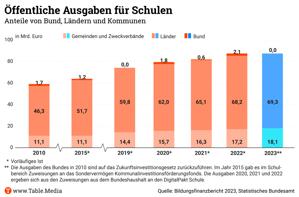 Rein rechnerisch entfallen damit auf jeden Einwohner 2.090 Euro, bezogen auf die unter 30-Jährigen sind es 6.940 Euro. Der Anteil der Bildungsausgaben am Bruttoinlandsprodukt lag wie schon 2021 bei 4,6 Prozent. Ein Jahr zuvor waren es noch 4,8 Prozent. Zwei Drittel der Bildungsausgaben stemmen die Landeshaushalte. Aus den Ländern kommen 122 Milliarden Euro für Bildung, davon 68,2 Milliarden Euro für Schulen. Die Gemeinden zahlen für Bildung 41,8 Milliarden Euro, davon 41 Prozent für Schulen. Der Bund hat im vergangenen Jahr 12,5 Milliarden Euro gezahlt. Dabei kommt aber nur ein kleiner Teil bei den Schulen an – im Wesentlichen für den Digitalpakt I.