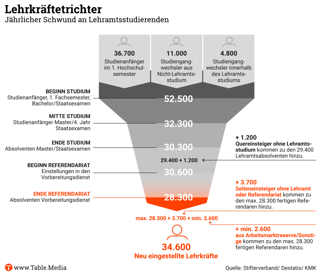 Mehr als 50.000 Studentinnen und Studenten beginnen in Deutschland durchschnittlich jedes Jahr ein Lehramtsstudium. Bis zum Ende des Referendariats gelangen jedoch lediglich rund 28.000, wie eine Berechnung des Stifterverbands zeigt. Das entspricht einem Schwund von rund 44 Prozent. Im Detail lässt sich aus diesen Durchschnittswerten verschiedener Jahrgänge nicht herauslesen, zu welchem Zeitpunkt und in welcher Zahl Studierende ihr Lehramtsstudium abbrechen. Dennoch verdeutlicht dieser Wert, wie groß die Mitverantwortung der Unis ist, das Lehrkräftedefizit aufzulösen.