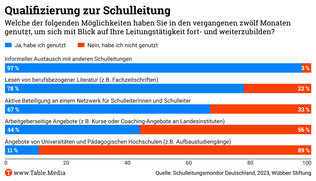 Ein Problem dabei ist allerdings: Die meisten Schulleiter sind in Deutschland gar nicht dafür ausgebildet, solche Prozesse zu steuern. Wie der “Schulleitungsmonitor Deutschland” der Wübben Stiftung zeigt, hat jede zweite Schulleitung keine formale Qualifikation an einem Landesinstitut absolviert, und kaum jemand kann eine Weiterbildung an einer Hochschule vorweisen.