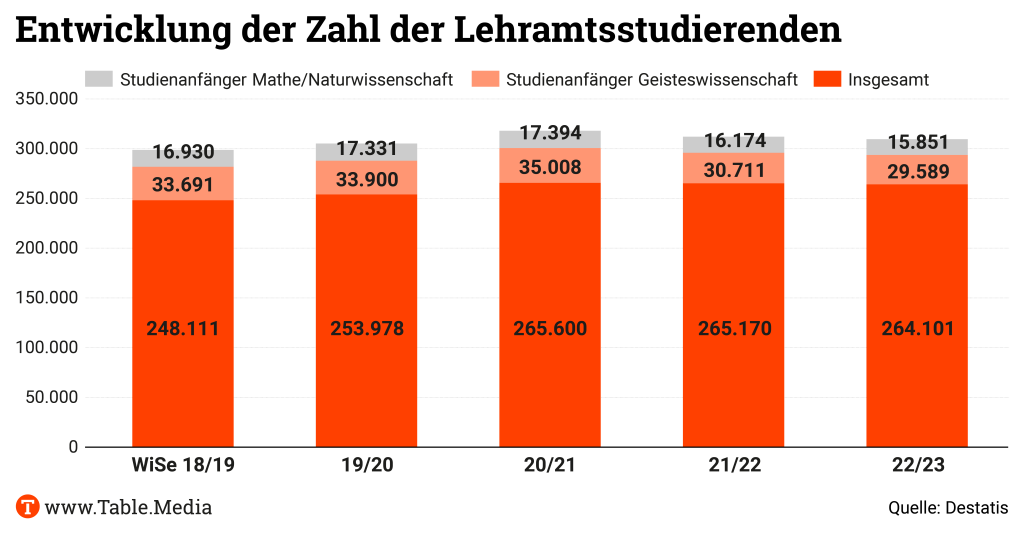 Lediglich die Zahl der Lehramtsstudierenden insgesamt liegt konkret vor. Diese ist in den vergangenen fünf Jahren in einigen Bundesländern stetig gestiegen. In Bremen, Hessen, Hamburg, Rheinland-Pfalz und Saarland gab es dagegen im Wintersemester 2022/23 weniger Studierende als noch vor fünf Jahren. Das geht aus den Antworten der Bundesregierung auf eine Kleine Anfrage der Linksfraktion hervor, die Table.Media exklusiv vorliegt. Bei den Studienanfängern gab es ebenfalls einen Rückgang.