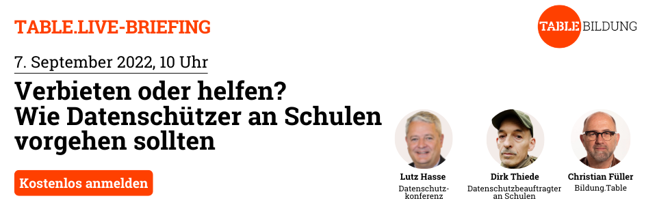 Wie eigentlich sieht eine funktionierende und zugleich regelkonforme IT-Lösung fürs deutsche Klassenzimmer aus? Man möchte meinen, diese Frage sei im Jahr 2022, nach der Digitalisierungswelle während Corona, zweifelsfrei geklärt. Dem ist aber nicht so. Es ist nicht einmal klar, ob MS 365 erlaubt ist. Datenschützer haben angedroht, gegen das System vorzugehen – und tun es bereits. Bildung.Table kann die Frage nicht abschließend klären – aber will darüber diskutieren. In einem Table.Live-Briefing am Mittwoch, 7. September sprechen wir daher mit Deutschlands oberstem Bildungsdatenschützer, Lutz Hasse, und dem Medienberater und Schuldatenschützer aus dem Kreis Olpe, Dirk Thiede.