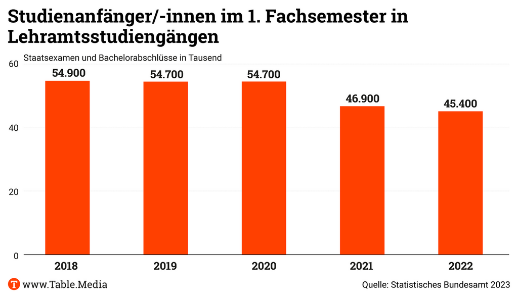 Der Lehrermangel an den Schulen droht sich auch mittelfristig weiter zu verschärfen. Die Zahl der erfolgreichen Abschlüsse im Lehrerstudium verharrt auf einem Zehnjahrestief. Aber auch die Zahl der Studienanfänger sinkt weiter. Vergangenes Jahr haben rund 10.000 weniger Bewerber ein Lehramtsstudium begonnen als vor fünf Jahren. Das zeigen neue Zahlen aus dem Statistischen Bundesamt. Im Jahr 2022 haben demnach 28.700 Studierende erfolgreich das Lehramtsstudium abgeschlossen. Neu angefangen haben 45.000 Studierende. Die Schulen sind vor allem im Bereich Sekundarstufe I und in Mangelfächern auf diese potenziellen Junglehrer angewiesen.