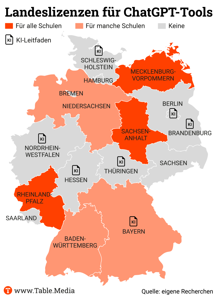 Eigenständige KI-Leitfäden gibt es in sieben Ländern. Andere haben umfangreiche Linklisten angelegt, etwa Baden-Württemberg und Rheinland-Pfalz.