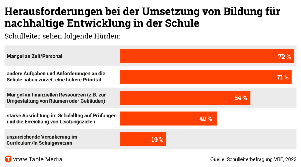 Dabei hat sich Deutschland zur Umsetzung des Programms “BNE 2030” der Unesco verpflichtet und bereits 2017 einen Nationalen Aktionsplan BNE entwickelt. Doch während sich Schüler mehr Nachhaltigkeit im Unterricht wünschen, kommt dies in der Praxis oft nicht an. Unter anderem fehlt es an Zeit und Ressourcen. “Nachhaltigkeit finden zwar nahezu alle wichtig und wünschenswert – doch bei der Priorisierung mangelt es”, sagt der am BNE-Monitoring beteiligte FU-Forscher Jorrit Holst im Gespräch mit Table.Media. “Wenn andere Dinge dafür zurückgestellt werden müssen, fallen Nachhaltigkeit und BNE bislang oft hinten runter – beim Schulbau genauso wie bei der Unterrichtsgestaltung.”