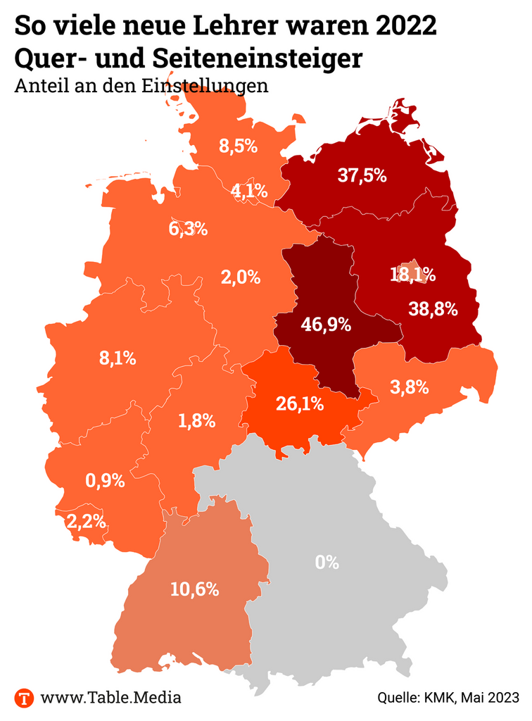 Gleichzeitig sind sie auch bundesweit ungleich verteilt. Da in ländlichen Gebieten häufig mehr Lehrerinnen und Lehrer fehlen als in den Städten, kommen dort mehr Nicht-Pädagogen zum Einsatz. Die ostdeutschen Bundesländer setzen mehr auf sie als die westlichen. Sachsen-Anhalt bildet hier die Spitze: Fast die Hälfte aller Neueinstellungen waren dort 2022 Quereinsteiger. Brandenburg und Mecklenburg-Vorpommern folgen mit über einem Drittel. Am besten stehen Hessen, Rheinland-Pfalz und Bayern da: Dort waren 2022 unter zwei Prozent der Neueinstellungen Quer- und Seiteneinsteiger. Vera Kraft