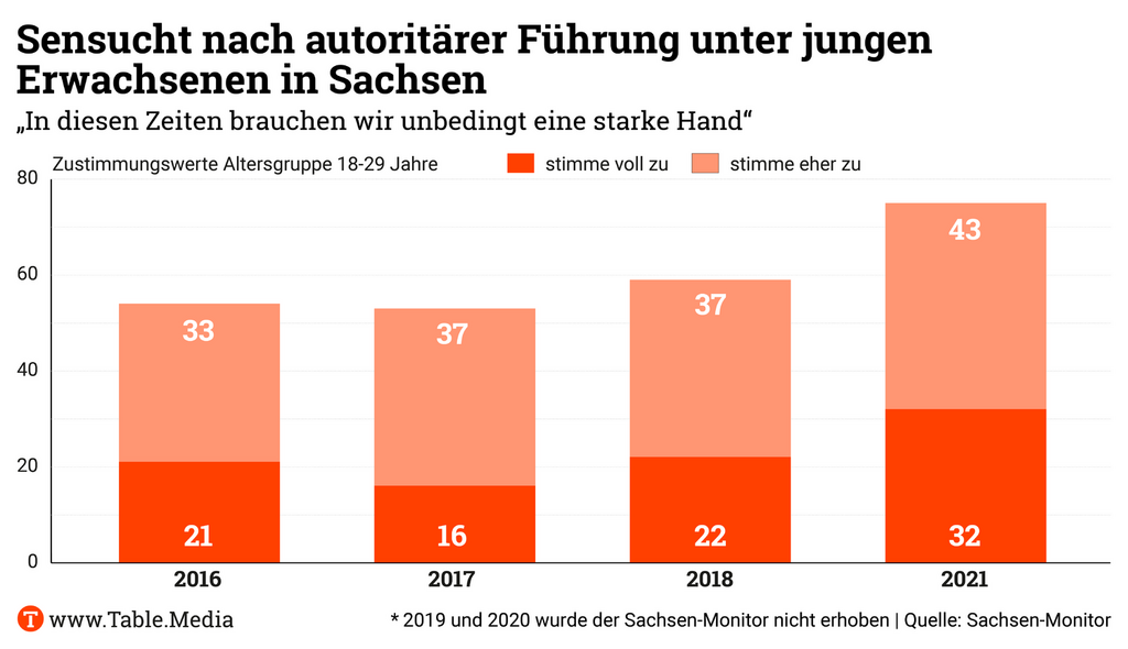 Wie hoch das Risikopotenzial einer fehlenden politischen Bildung ist, lässt sich an Studien ablesen. 77 Prozent der Befragten zwischen 14 und 24 Jahren haben nicht das Gefühl, dass Politik sich überhaupt für sie interessiert. Auch ein Papier, das die Hertie-Gutachter gar nicht berücksichtigen, unterstreicht die Größe der Herausforderung: 75 Prozent der 18- bis 29-Jährigen in Sachsen sind der Meinung, dass es in der derzeitigen Lage “unbedingt eine starke Hand braucht.” Das ist nicht nur im Vergleich zu den anderen Altersgruppen der mit Abstand höchste Wert. Es ist zugleich der Gipfel einer sich zuspitzenden Entwicklung seit 2016. (Siehe Grafik)