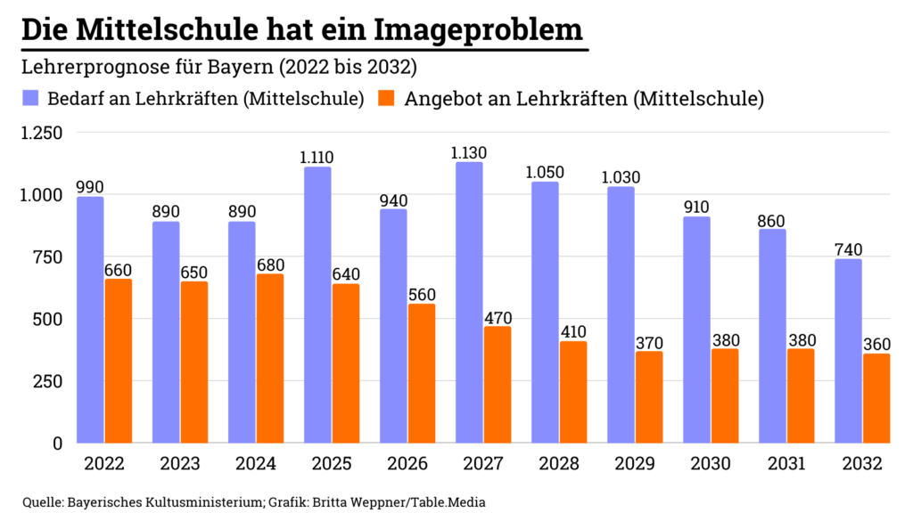 Bis zum Ende des Jahrzehnts wird sich der Lehrermangel an den bayerischen Mittelschulen, früher mal Hauptschule genannt, dramatisch zuspitzen. Das geht aus der neuen Lehrerprognose des Kultusministeriums hervor, die Bildung.Table vorab vorlag (zum Download). Schon jetzt sind viele Schulen am Limit. Und bis 2032 fehlen weitere 5000 Lehrkräfte und damit ein Viertel der rund 20.000 Pädagogen, die derzeit an den Mittelschulen im Freistaat arbeiten.
