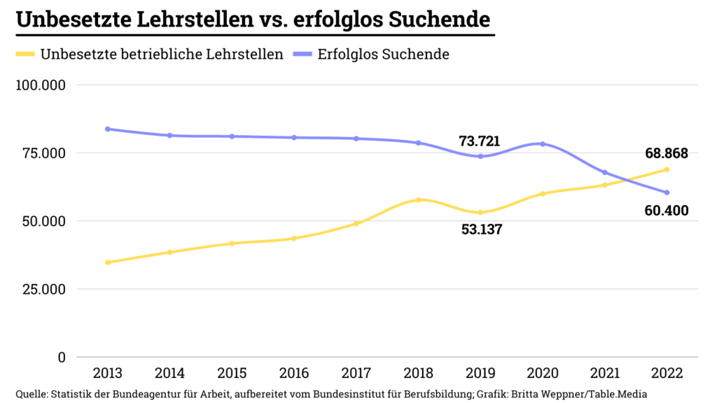 Mit den 68 900 noch unbesetzten Lehrstellen gibt es in der diesjährigen Bilanz des Instituts für Berufsbildung erstmals etwas mehr freie Plätze auf dem Ausbildungsmarkt als noch unversorgte Bewerber. Berufsforscher sprechen schon seit Jahren von immer größer werdenden “Passungsproblemen” auf dem Lehrstellenmarkt. Das heißt, Vorstellungen der Arbeitgeber und ihre Anforderungen an die Qualifikation sind mit Berufswünschen der Jugendlichen kaum noch in Einklang zu bringen. Hinzu kommen regionale Probleme. Häufig gibt es freie Ausbildungsplätze dort, wo nicht genügend junge Menschen wohnen, wo Wohnheime für Azubis fehlen oder wo es keine günstige Verkehrsinfrastruktur zur Nachbarregion gibt.