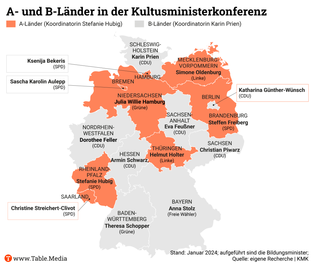 Wenige Tage später standen die Nachfolgerinnen für die Koordinatorenrolle fest: die Bildungsministerinnen aus Rheinland-Pfalz und Schleswig-Holstein, Stefanie Hubig (SPD) und Karin Prien (CDU). Beide sind nicht minder profiliert. Hubig ist seit 2016 in Mainz im Amt und war 2020 KMK-Präsidentin. Seit 2017 ist Prien Bildungsministerin in Kiel, das Amt der KMK-Präsidentin hatte sie 2022 inne. Welche Akzente wollen beide nun setzen? Table.Media hat nachgefragt.