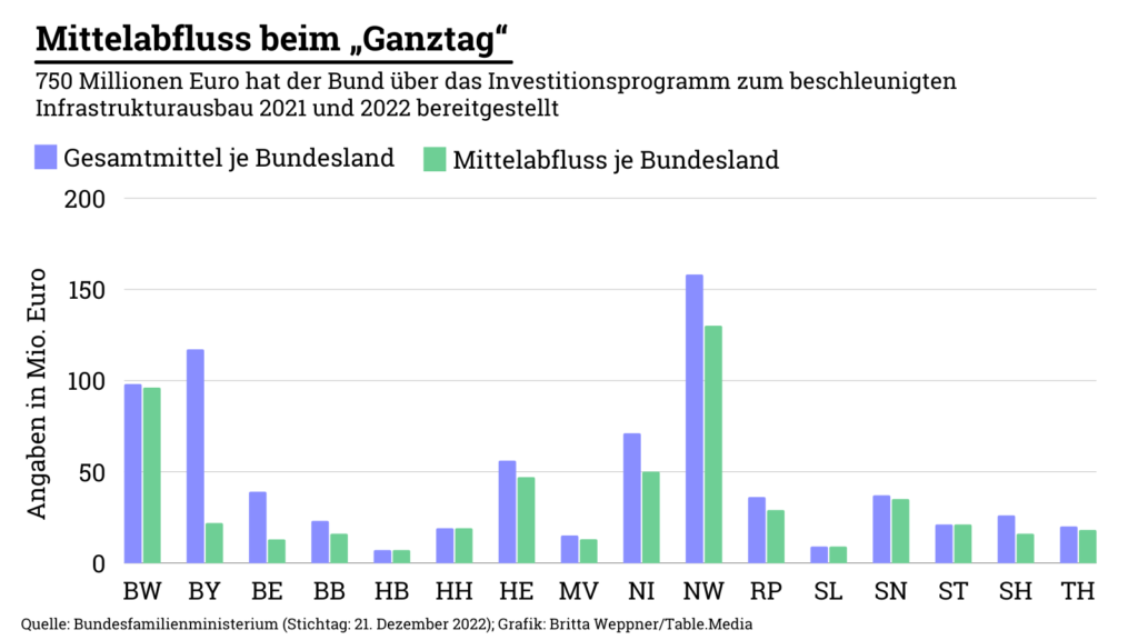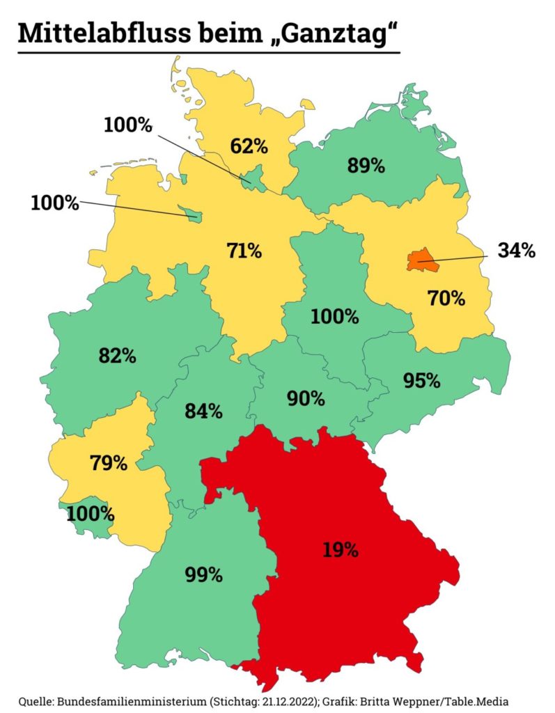 Während Hamburg, Bremen, das Saarland, Baden-Württemberg und Sachsen-Anhalt die gesamten Fördermittel abgerufen haben, sieht es in anderen Bundesländern schlechter aus. Bayern hat 19 Prozent der Mittel abgerufen, Berlin 34 Prozent. Das Bundesfamilienministerium betont, dass vom Abruf der Mittel nicht direkt auf die “Investitionstätigkeit” geschlossen werden kann. Die Länder könnten das Geld auch während oder nach Abschluss einzelner Maßnahmen, wie beispielsweise Umbauten an den Schulen, abrufen.