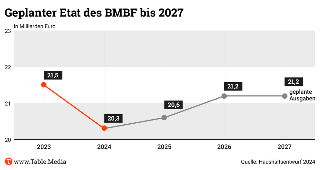 Zum Auftakt der Haushaltsverhandlungen im Bundestag übt der Bundesrechnungshof harsche Kritik am Haushaltsentwurf des BMBF. Dem Ministerium würden 1,2 Milliarden Euro weniger als im Vorjahr zur Verfügung stehen. Zwar fällt die Kürzung geringer aus, wenn man die wegfallende Einmalzahlung an Studierende von insgesamt 700 Millionen Euro aus dem Haushalt 2023 mit einrechnet. Dennoch warnt der Rechnungshof: Bei inflationsbereinigter Betrachtung würden die Ausgaben erheblich sinken. Der Spielraum für neue Vorhaben oder für die Reaktion auf aktuelle Entwicklungen verringere sich, schreiben die Beamten im Bericht an den Haushaltsausschuss des Bundestags, der Table.Media vorliegt. “Jetzt müssen grundlegende Entscheidungen getroffen werden, welche Bereiche das BMBF noch finanzieren will und kann.”