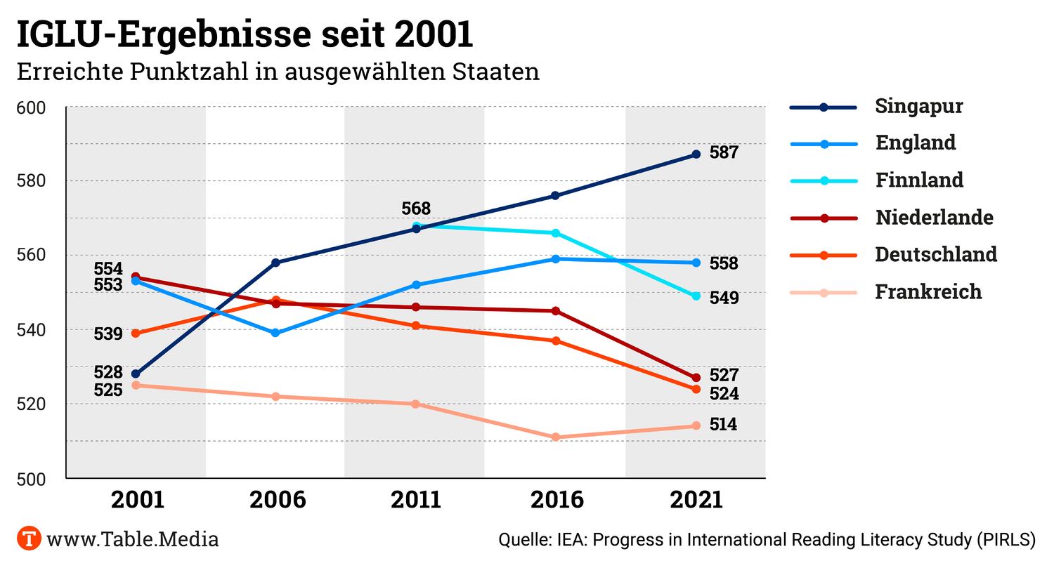 Die IGLU-Studie vergleicht alle fünf Jahre die Lesekompetenz von Viertklässlern in etwa 60 Staaten. Während sich in vergangenen Testzyklen viele Länder verbessern konnten, fallen nun besonders viele zurück. Nur drei Staaten weisen einen positiven Trend auf: Frankreich, England und Singapur.