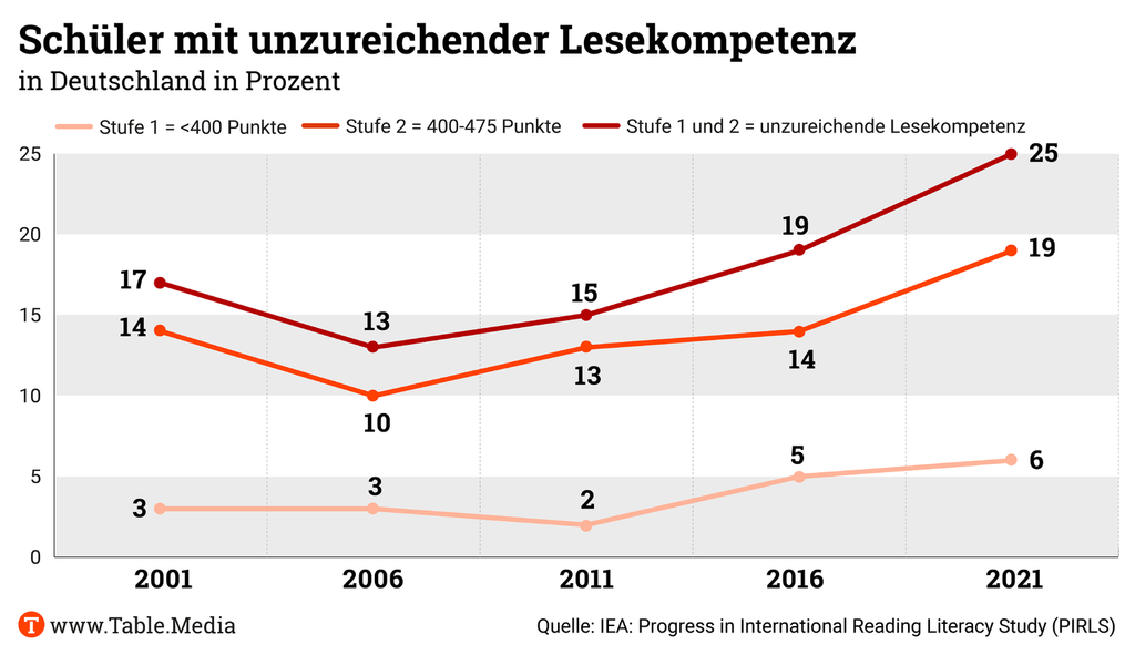 Besorgniserregend ist der hohe Anteil schwacher Leserinnen und Leser in Deutschland. Ein Viertel der Viertklässler erreicht nicht den internationalen Standard für eine erfolgreiche Lesekompetenz. Das heißt: Sie können basale Informationen erfassen, aber nicht so flüssig lesen, um sich Wissen selbstständig und lesend anzueignen. Ein Teil dieser Schüler kann, wie es in der Studie heißt, nur rudimentär lesen. Die Risikogruppe der schwachen Leser ist seit 2001 auf 25,4 Prozent gestiegen – was deutlich höher ist als 2016 (18,9 Prozent) oder 2001 (17,0 Prozent).