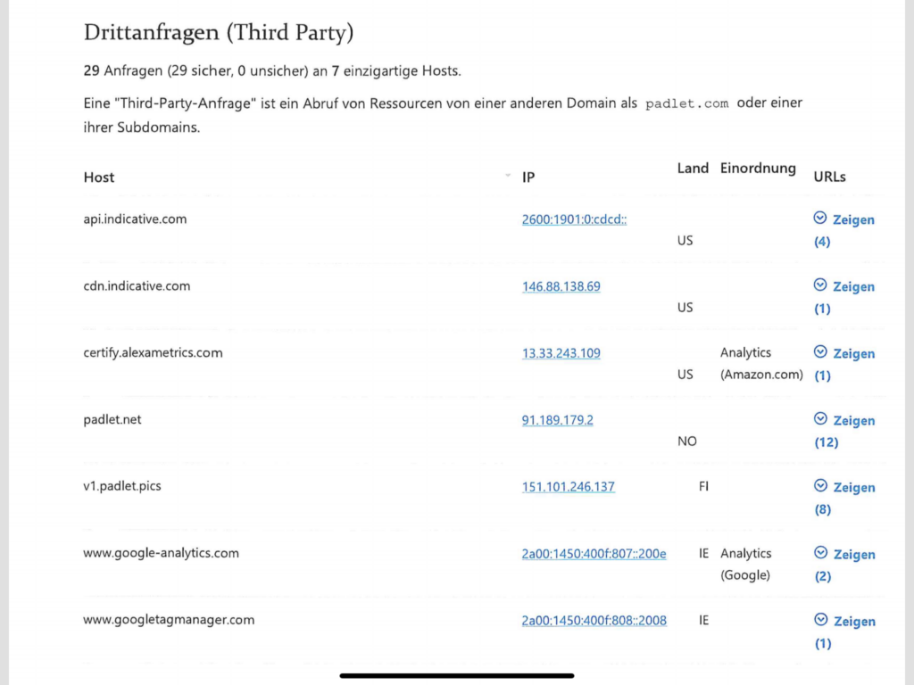 Schreiben 4 und 5: in diesen beiden Mails von Hasse an die staatlichen Schulen vom 25. Januar 2021 geht es praktisch nur um “Padlet“, eine digitale Pinnwand, die inzwischen viele Schulen und Lehrer benutzen, um Projekte vorzubereiten oder damit Schüler sich Übersichten erstellen können. Hasses IT-Ingenieure bemerken: “Dass offensichtlich Nutzerdaten auch an Dritte fließen, ist für jedermann einfach nachweisbar: Die in der Anlage beigefügte Webbkoll-Analyse zeigt auf Seite 6, dass Wallwisher Inc. eine Vielzahl von Tracking-Instrumenten von Drittanbietern eingebunden hat, die für den Zweck der Plattform nicht erforderlich sind.” Interessant ist hier, dass sich dank Frag-den-Staat nun jeder die Webbkoll-Analyse anschauen und sehen kann, welche Drittanbieter die Daten bekommen. (Screenshot) Hasses Conclusio: Hürden und Aufwand für den Einsatz von Padlet seien so hoch, “dass gegenwärtig eine Nutzung durch Schulen unmöglich ist”.