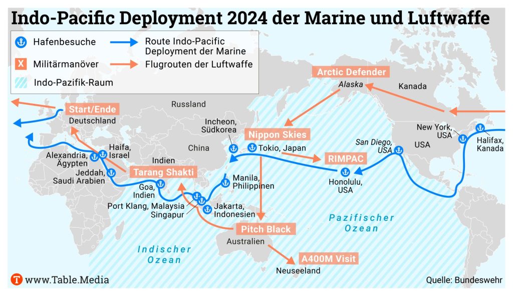 Die Bundeswehr ist seit vier Jahren verstärkt im indopazifischen Raum präsent. 2021 fuhr die Fregatte “Bayern” von August bis Februar 2022 in den Indopazifik, formell auf einer Auslandsausbildungsfahrt, allerdings mit diplomatischem und sicherheitspolitischem Auftrag. 2022 folgte dann erstmals die Luftwaffe, 2023 nahm das Heer zum ersten Mal an der Talisman Sabre-Übung in Australien teil. Das erneute Engagement der Luftwaffe im indopazifischen Raum werde von den asiatischen Staaten sehr begrüßt, sagt Luftwaffen-Inspekteur Ingo Gerhartz: “Als wir vor zwei Jahren erstmalig da waren, ist mir oft begegnet: Kommt ihr wieder oder ist das eine Eintagsfliege? Und das ist genau die Verstetigung dieses Vertrauens.”