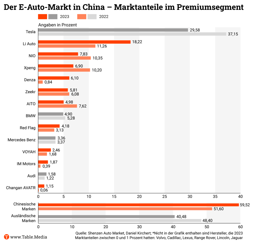 Noch wird ein Großteil der Premiumfahrzeuge, die in China gekauft werden, weiterhin von Verbrennern angetrieben. Doch der Anteil der E-Autos im Premiumsegment wächst schnell und in diesem Bereich sind die jungen chinesischen Marken führend. Experte Kirchert schätzt den Anteil der E-Autos am Premiumsegment 2022 etwa auf 31 Prozent, 2023 ist dieser nach seinen Berechnungen stark auf 42 Prozent gestiegen. Kirchert zählt folgende chinesische E-Auto-Marken zum Premiumsegment: