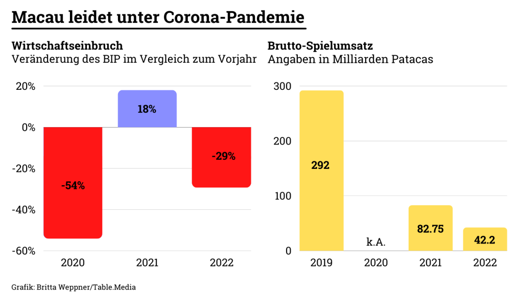 Analysten schätzen, dass Macaus Wirtschaft 2022 um rund 29 Prozent eingebrochen ist. Bereits 2020 war die Wirtschaft um 54 Prozent geschrumpft. Danach folgte 2021 eine leichte Erholung um 18 Prozent, weil China das Virus für einige Zeit unter Kontrolle hatte. Der Brutto-Spielumsatz ging im Vergleich zum Vorjahr um weitere 51 Prozent auf 42,2 Milliarden Patacas (rund 4,9 Milliarden Euro) zurück. 2019, im Jahr vor der Pandemie, hatten die Casinos noch 292 Milliarden Patacas umgesetzt.