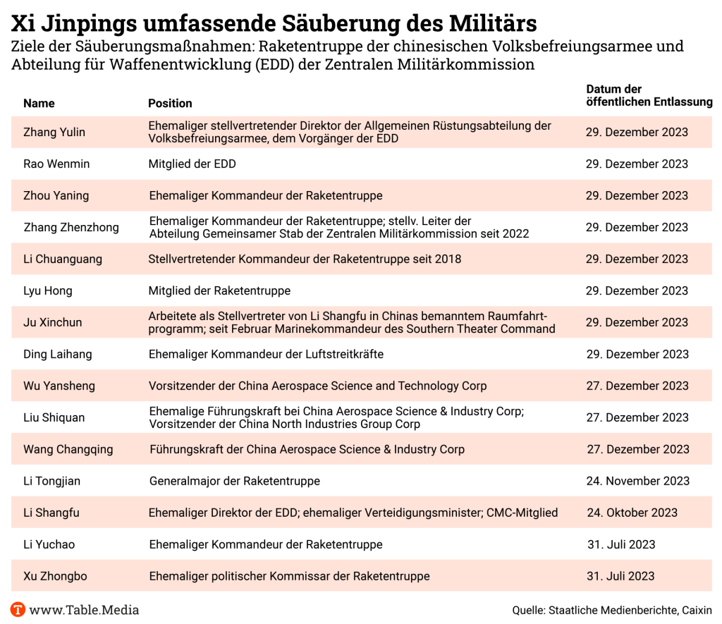 Zuletzt hatte das Zentralkomitee der Kommunistischen Partei neun ranghohe Militärvertreter aus dem Nationalen Volkskongress ausgeschlossen, darunter vier aus den Raketenstreitkräften (PLARF). Anfang August hatte Xi gar die gesamte Führung der Raketenstreitkräfte ausgewechselt. Selbst der ehemalige Verteidigungsminister Li Shangfu (李尚福) wurde nach diesem Muster gestürzt. In der Folge blieb der Ministerposten monatelang unbesetzt. Erst Ende Dezember wurde mit Admiral Dong Jun ein Nachfolger ernannt.