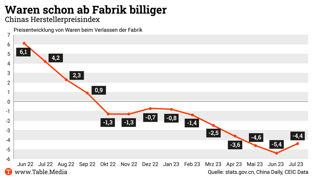 Die Inflation in China ist wie befürchtet unter die Nullinie gerutscht. Sie lag im Juli bei minus 0,3 Prozent. Damit herrscht jetzt offiziell Deflation, also ein Zustand fallender Preise, den Ökonomen in mancherlei Hinsicht für gefährlicher halten als Inflation. Deflation setzt Anreize dafür, Anschaffungen zu verschieben. Die Kaufzurückhaltung schadet der chinesischen Konjunktur derzeit besonders, weil auch der Export schwächelt. Er sank im Juli um 14,5 Prozent.