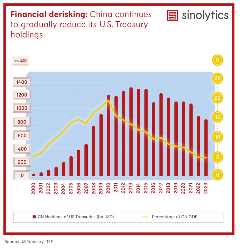 Chinas große Vermögenswerte in den USA und im westlichen Block machen das Land anfällig für US-Sanktionen. Das Land könnte von der Refinanzierung über das Dollarsystem abgeschnitten werden, und seine ausländischen Vermögenswerte könnten eingefroren werden. Die Sanktionierung von Banken, die an Transaktionen jenseits des Dollars beteiligt sind, könnte Chinas Finanzierungsmöglichkeiten weiter einschränken.