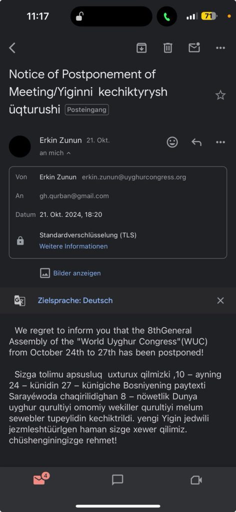 Diese Email erhielten die Delegierten der achten Generalversammlung des WUC vom Account von Chef-Koordinator Erkin Zunun. Die vermeintliche Absage soll offenbar Verwirrung stiften.