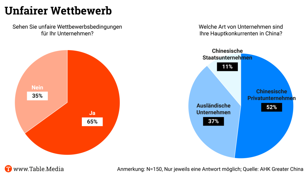 Doch zunächst nach China. Hier ist das Hauptproblem eindeutig: Fast zwei Drittel (65 Prozent) der deutschen Unternehmen in China sehen sich in einem unfairen Wettbewerb. “Das ist ein hoher Wert, der unserer Politik zeigt, dass das wirklich eines der primären Themen ist, die hier bei der chinesischen Führung angesprochen werden müssen”, sagte Maximilian Butek, geschäftsführendes Vorstandsmitglied der Deutschen Handelskammer in Peking. “Die rechtlichen Rahmenbedingungen in China schwächen die Wettbewerbsfähigkeit deutscher Unternehmen.”