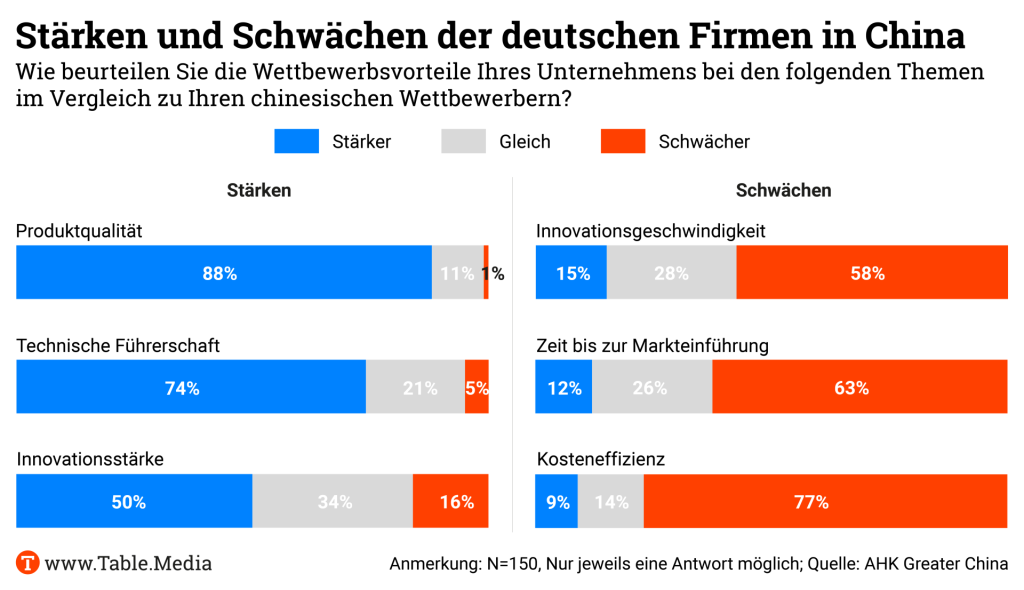 Die Konsequenz für die deutschen Unternehmen in China: Der lokale Wettbewerb hat in den vergangenen Jahren dramatisch zugenommen. Zwar können deutsche Firmen nach wie vor mit Produktqualität und technischer Führerschaft punkten. Doch schon beim Aspekt Innovationsstärke zeigt die AHK-Studie, wie sehr sich die Kräfteverhältnisse inzwischen verschoben haben: Nur die Hälfte der deutschen Unternehmen glaubt noch, dass ihre Innovationsstärke größer sei als bei der Konkurrenz. Für AHK-Mann Butek ist das ein Faktor, der überrascht.