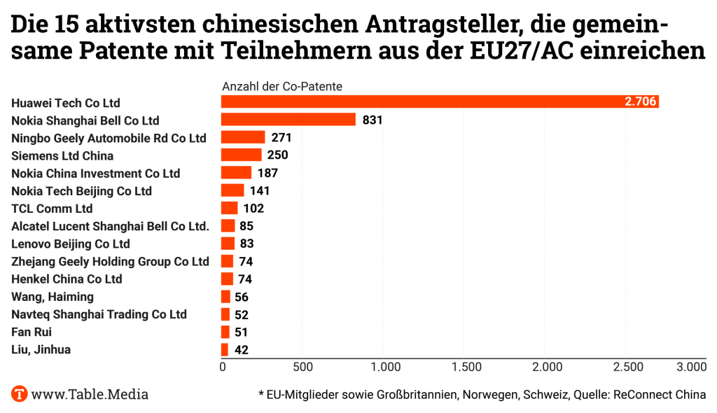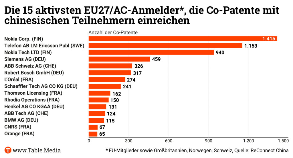 “Bei den Ländern ist Deutschland der größte Patentpartner für China in Europa, gefolgt von Finnland, Schweden und Frankreich”, sagt Mitautor Philipp Brugner zu Table.Media. “Das zeigt sich auch in der Herkunft der Firmen, die involviert sind.” Nokia aus Finnland führe das Feld an, gefolgt von Ericsson, einer Nokia-Tochter, Siemens, ABB, Bosch und L’Oréal. Es sind allesamt Großkonzerne.