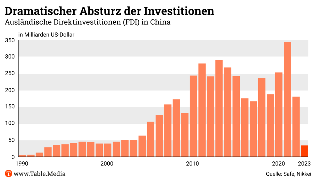 von wegen De-Risking: Deutsche Konzerne haben 2023 mehr in China investiert als je zuvor. Damit haben sie sich gegen einen mächtigen internationalen Trend gestellt, denn im Gesamtbild sind die Direktinvestitionen in China auf ein Dreißigjahrestief gefallen.