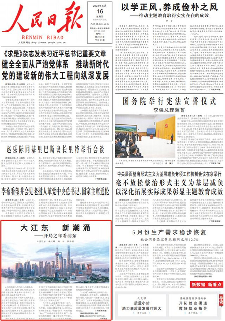 Als Vorreiter der Reform und Öffnung sei Shanghai neben einem Wirtschafts-, Finanz-, Handels- und Schifffahrtszentrum auch zu einer Stadt geworden, in der Raketen, Satelliten, Groß-Schiffe und Verkehrsflugzeuge entwickelt werden. Eine lange Aufzählung schildert Shanghais Ausbau zum Zentrum für Hightech und Innovationen, für Handels- und Finanzmärkte und ihre Internationalisierung, für strategische Rohstoffe, für Zukunftsbranchen bis hin zu künstlicher Intelligenz und für Industriecluster von Weltklasse.