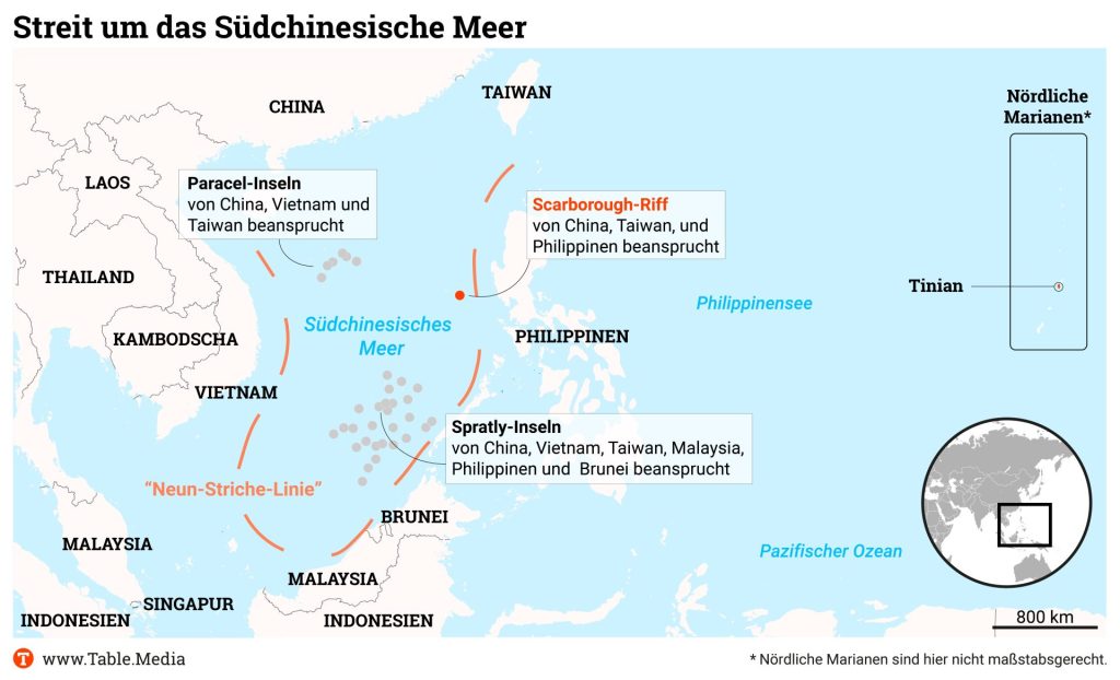 Wer hier die Kontrolle hat, ist in einer überaus mächtigen Position. Als Teil der ersten Inselkette und in unmittelbarer Nähe zu Taiwan sind die Philippinen strategisch äußerst wichtig. Scholz betonte denn auch am Dienstag in Berlin nochmals Deutschlands Unterstützung für die Philippinen, um die regelbasierte Ordnung im Südchinesischen Meer aufrechtzuerhalten.