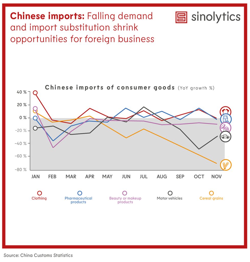 Mit einem Anteil von rund elf Prozent an den weltweiten Einfuhren ist China nach wie vor der zweitgrößte Importeur von Konsumgütern: Im Jahr 2023 lagen die Importe bei 275 Milliarden Dollar. Der anhaltende Rückgang unterstreicht jedoch eine Veränderung der Wettbewerbsdynamik auf dem chinesischen Markt.