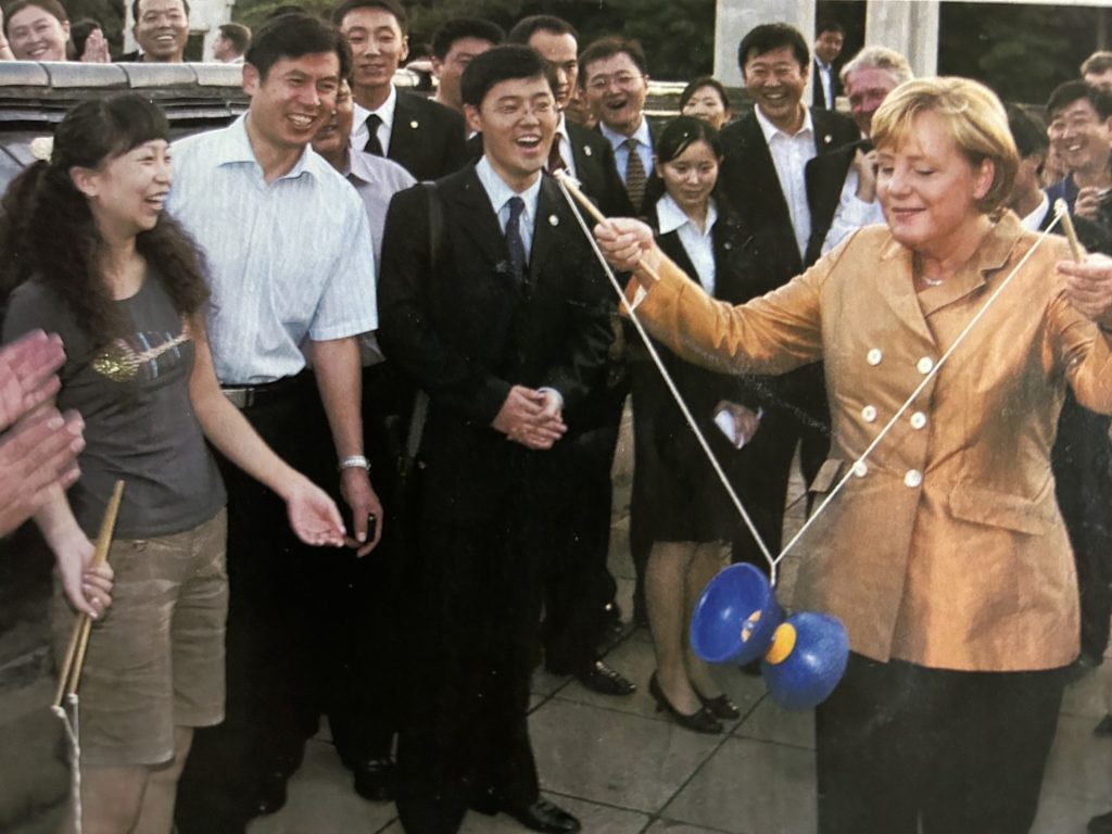 Angela Merkel wollte während ihres kurzen Antrittsbesuches in China im Mai 2006 mehr als nur Pekinger Konferenzräume sehen. Sie ließ sich von ihrem Gastgeber, dem damaligen Premier Wen Jiabao, zum Spaziergang in den Pekinger Park 北京菖蒲河公园 überreden. Mit Frühsporteinlage: Wen zeigte ihr wie man Taiji-Ball spielt. 太极柔力球.