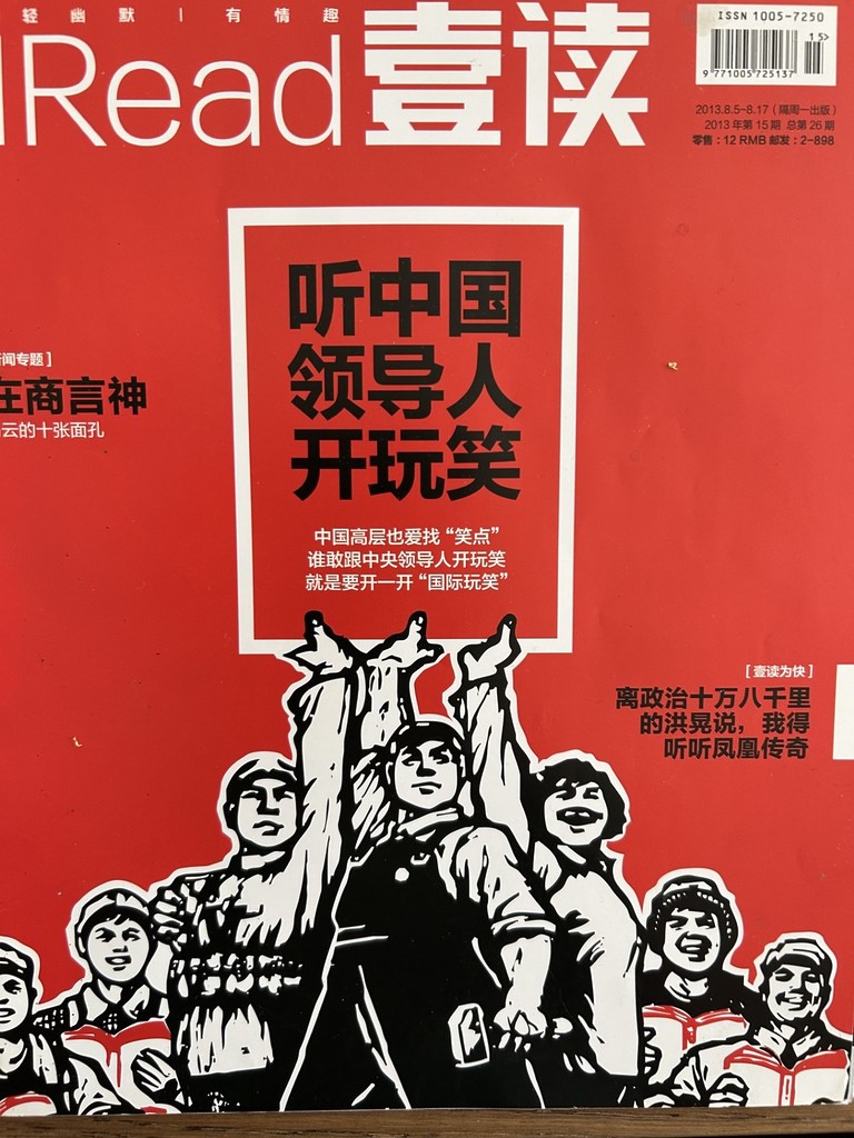 2014 wurde politischer Humor in Grenzen toleriert. Umschlagzeichnung des Magazin “Read”, die ein Motiv der Kulturrevolution umfunktioniert für ihre Titelgeschichte: Hört, welche Witze sich Chinas Führer erzählen. Heute würde die Zensur einen solchen Titel verbieten.