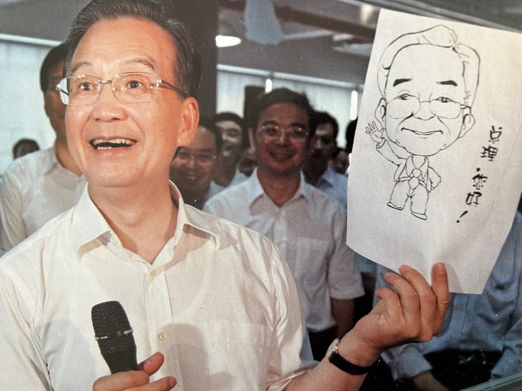 Premier Wen Jiabao. Foto vom Februar 2012, als Wen sich lachend öffentlich mit einer Karikatur von sich selbst zeigt.